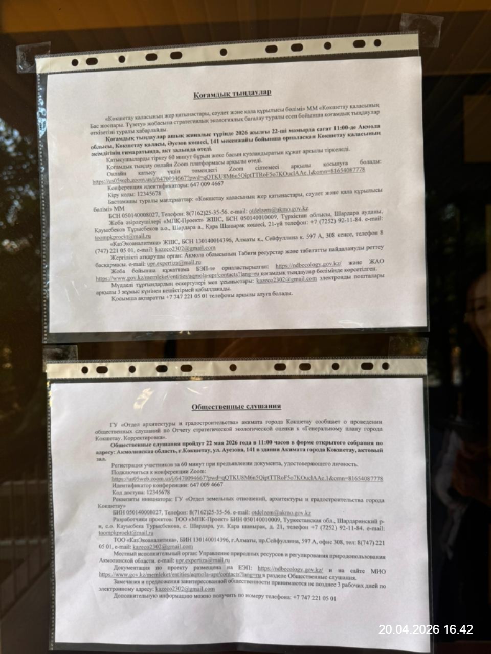 3. Общественные слушания организованны: Управление природных ресурсов и регулирования природопользования Акмолинской области, upr.expertiza@mail.ru тел: 8 (7162) 40-28-07,