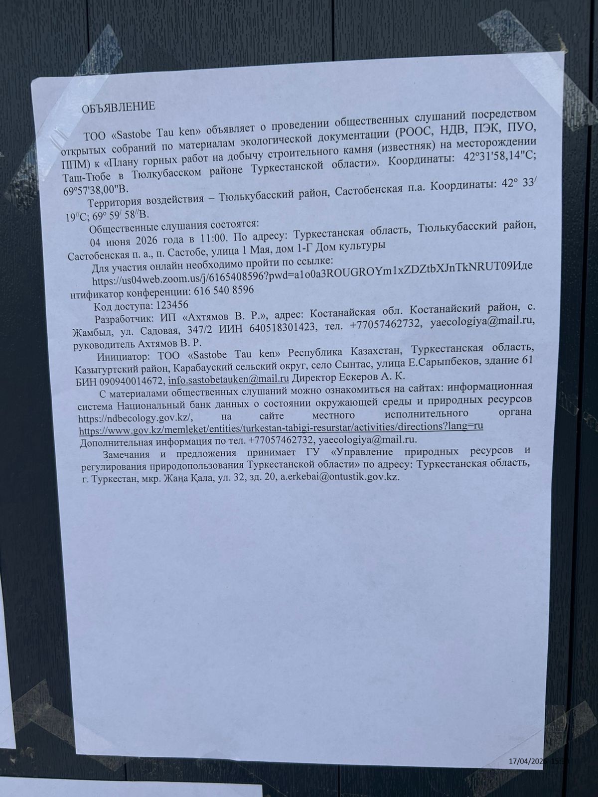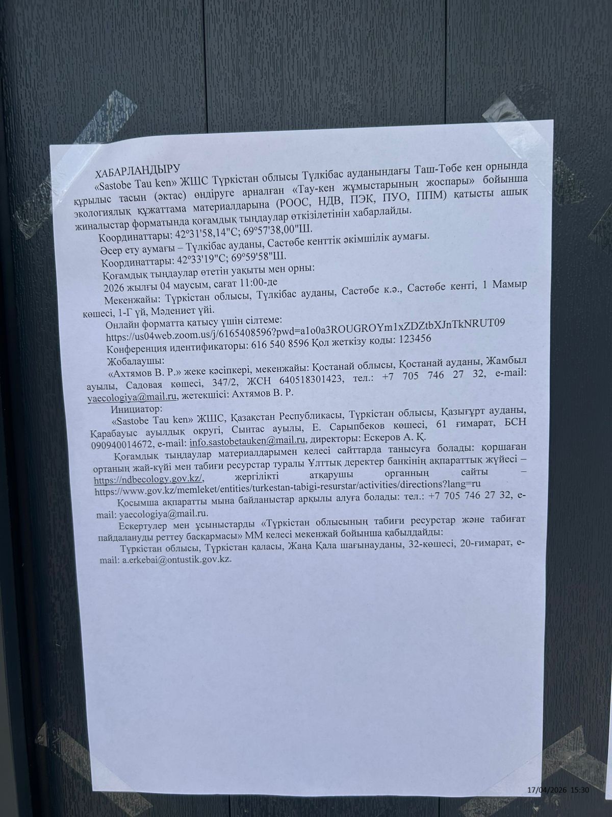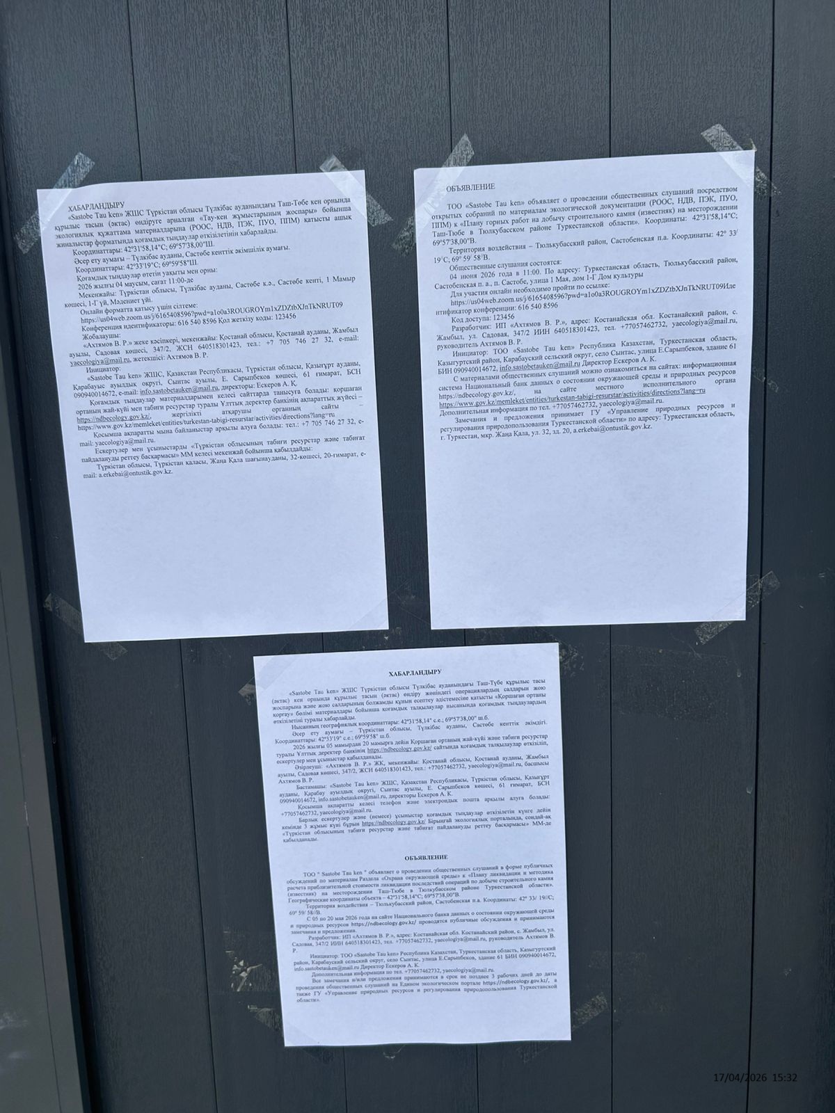 3. Общественные слушания организованны: Управление природных ресурсов и регулирования природопользования Туркестанской области, a.erkebai@ontustik.gov.kz,