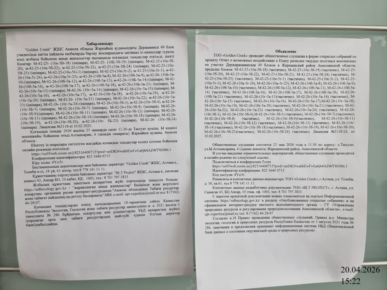 3. Общественные слушания организованны: Управление природных ресурсов и регулирования природопользования Акмолинской области, upr.expertiza@mail.ru тел: 8 (7162) 40-28-07,