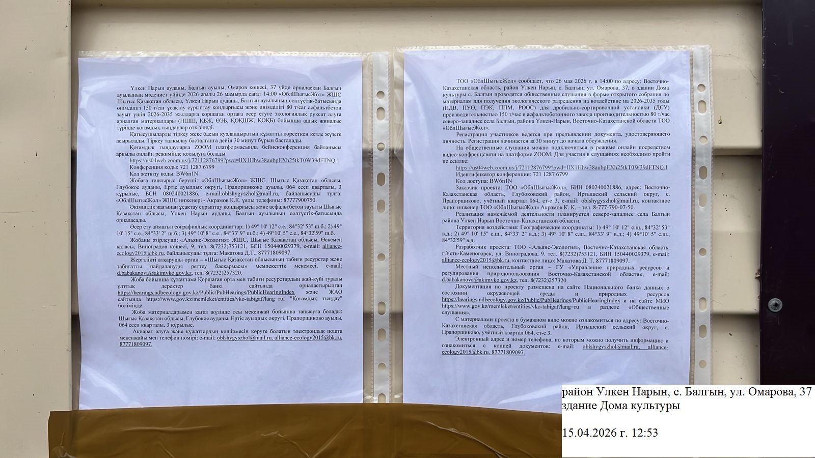3. Общественные слушания организованны: Управление природных ресурсов и регулирования природопользования Восточно-Казахстанской области, d.babakanova@akimvko.gov.kz,