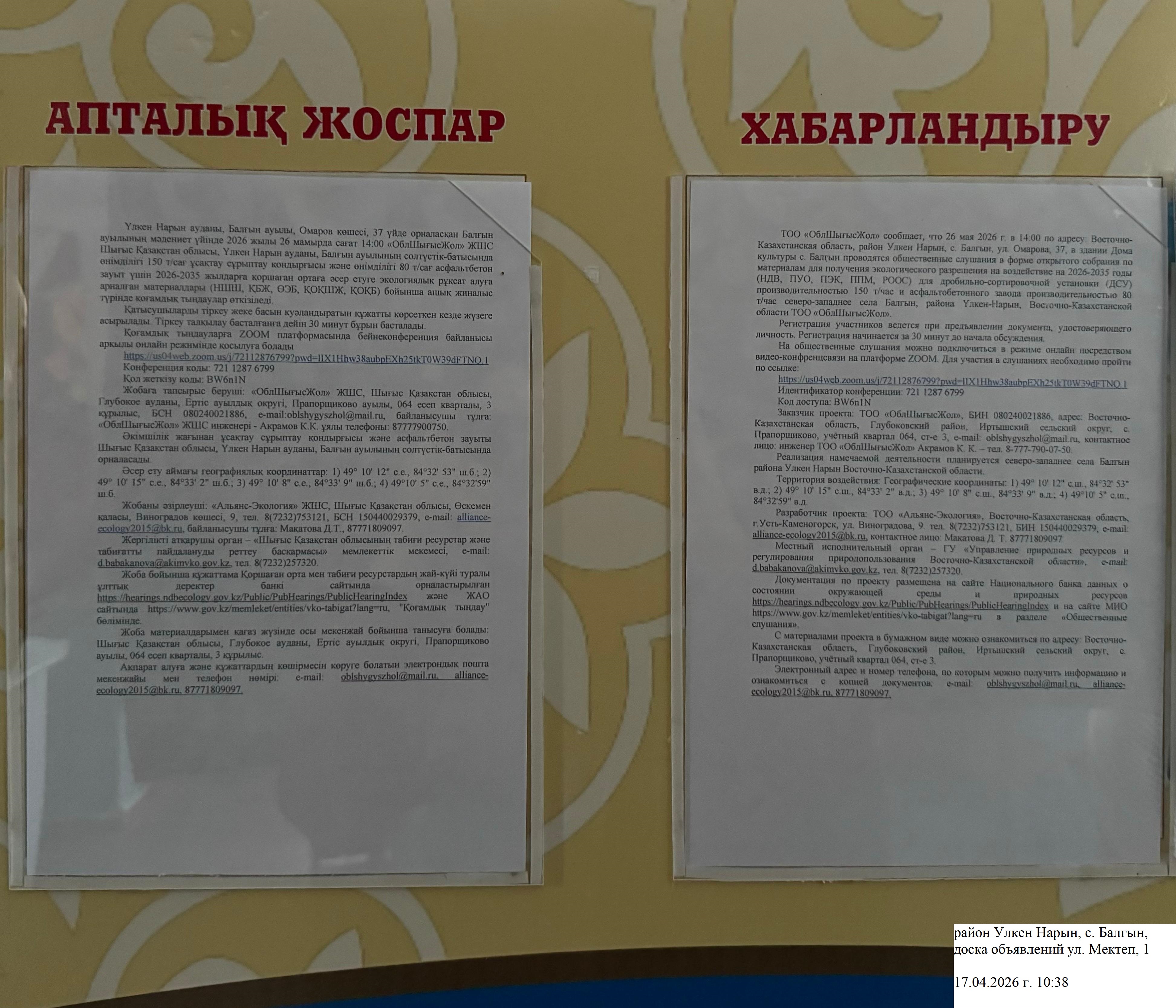 6. Объявление о проведении общественных слушаний на казахском и русском языках будет распространено следующими способами: