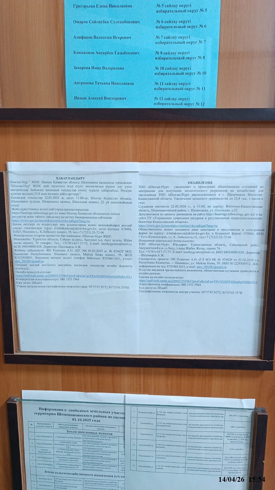 6.3. расположение мест, специально предназначенных для Размещения печатных объявлений (доски объявлений): Восточно-Казахстанская область, Шемонаихинский район, г. Шемонаиха, здание аппарата Акима города Шемонаиха, Шемонаихинского района, Восточно-Казахстанской области