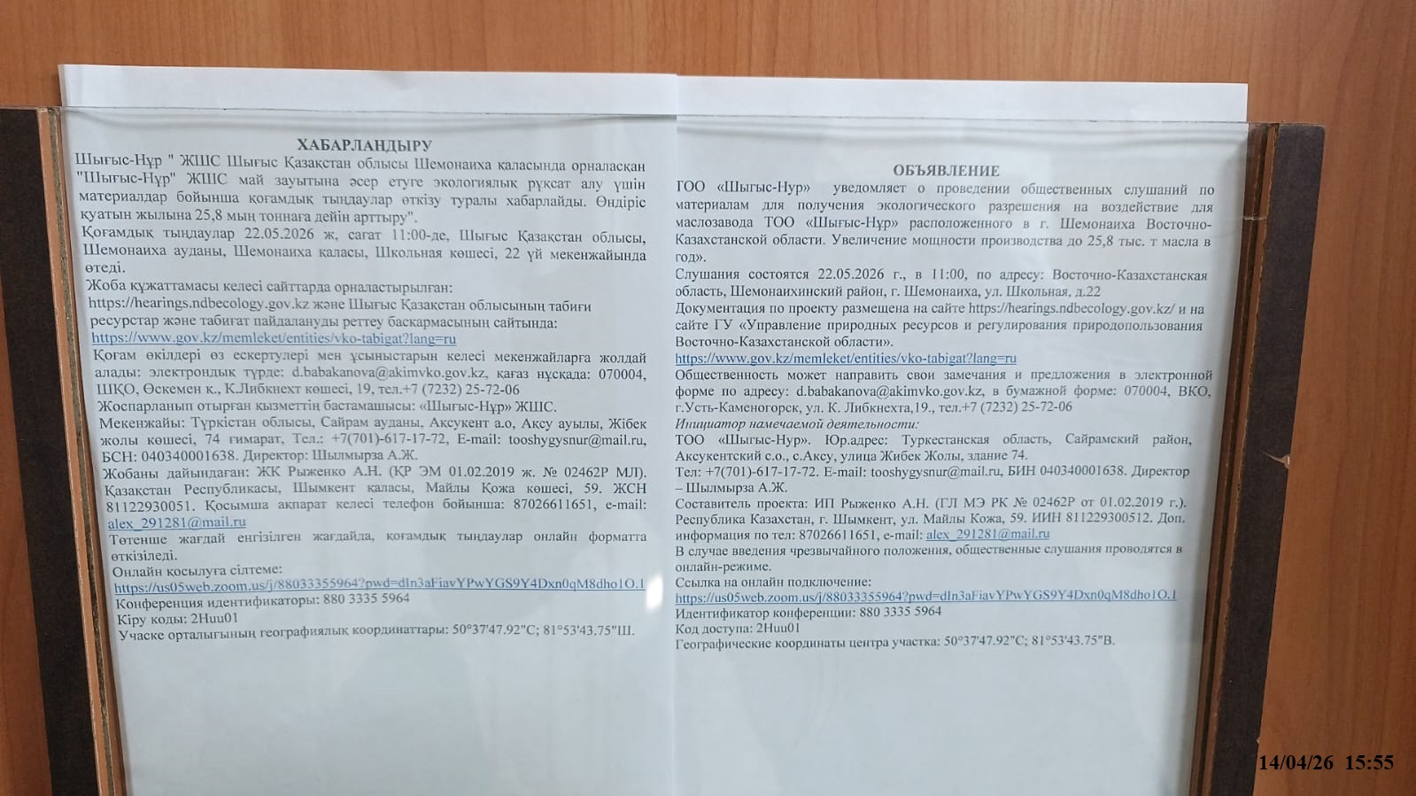 3. Общественные слушания организованны: Управление природных ресурсов и регулирования природопользования Восточно-Казахстанской области, d.babakanova@akimvko.gov.kz,