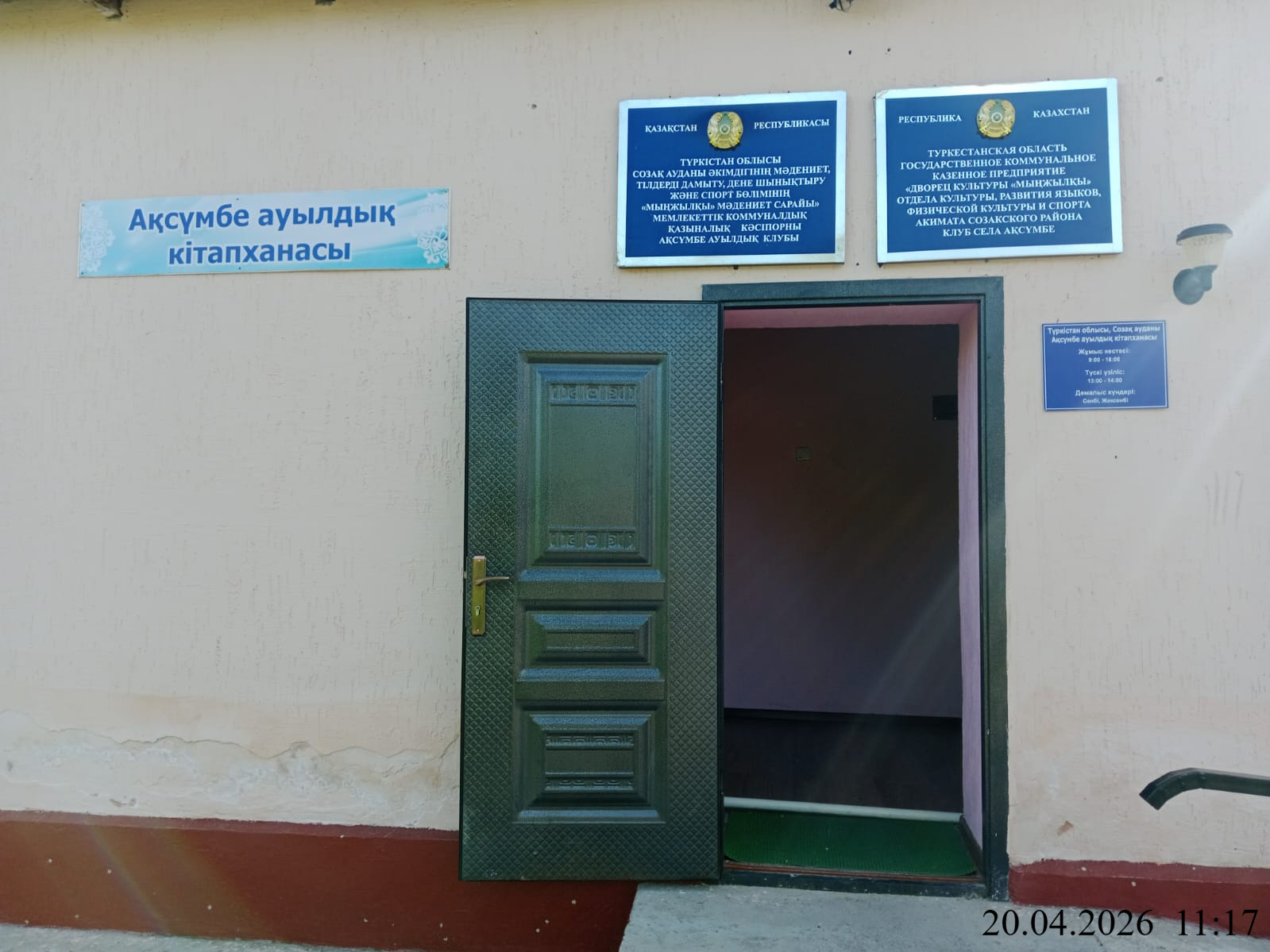 6.3. расположение мест, специально предназначенных для Размещения печатных объявлений (доски объявлений): Туркестанская область, Сузакский район, Каратауский с.о., с.Аксумбе, здание дома культуры, улица Акбикеш, 23