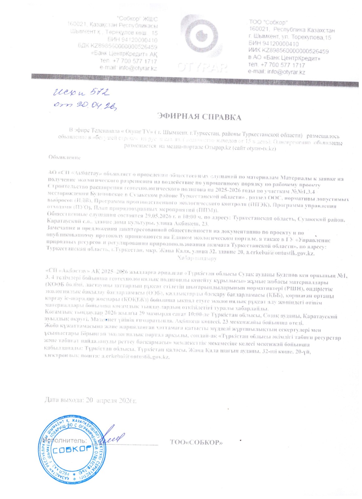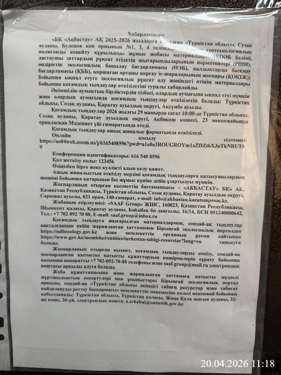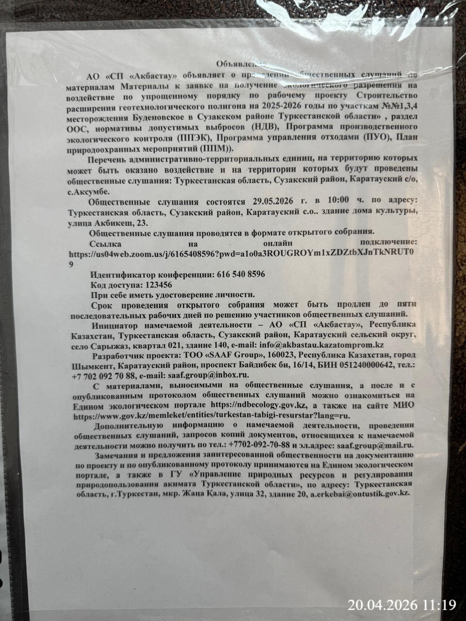 3. Общественные слушания организованны: Управление природных ресурсов и регулирования природопользования Туркестанской области, a.erkebai@ontustik.gov.kz,