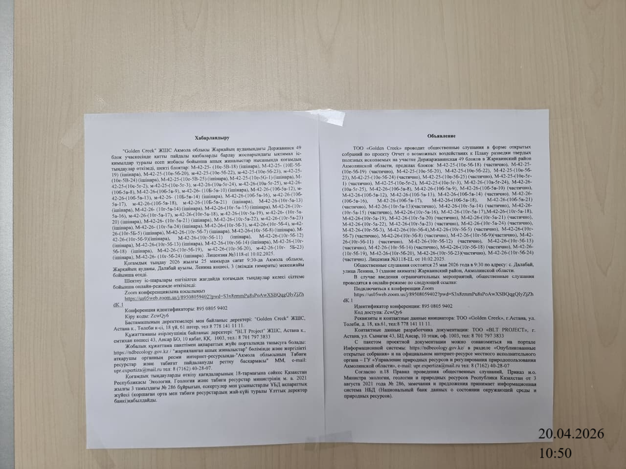 6. Объявление о проведении общественных слушаний на казахском и русском языках будет распространено следующими способами: