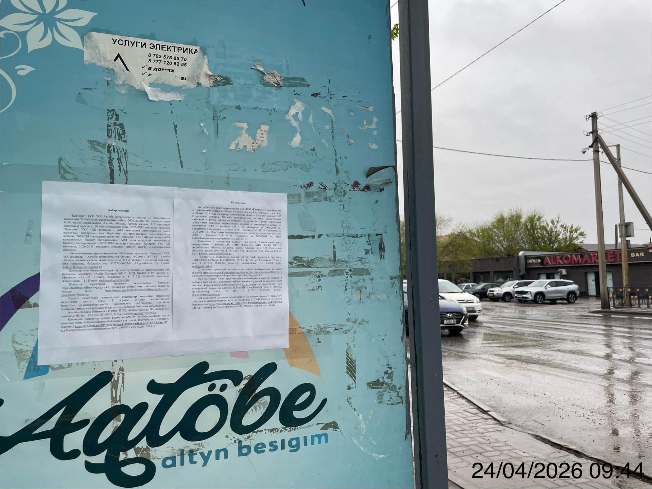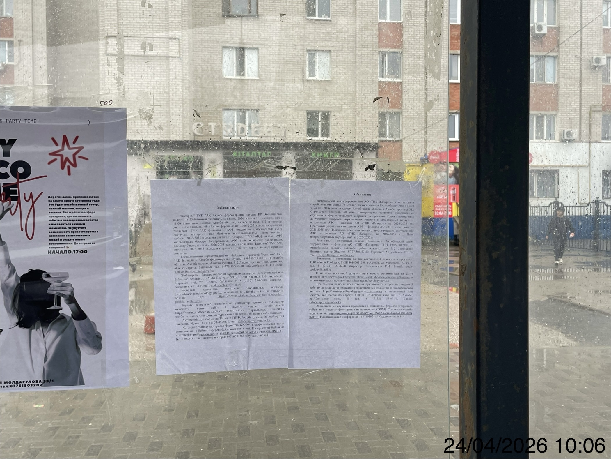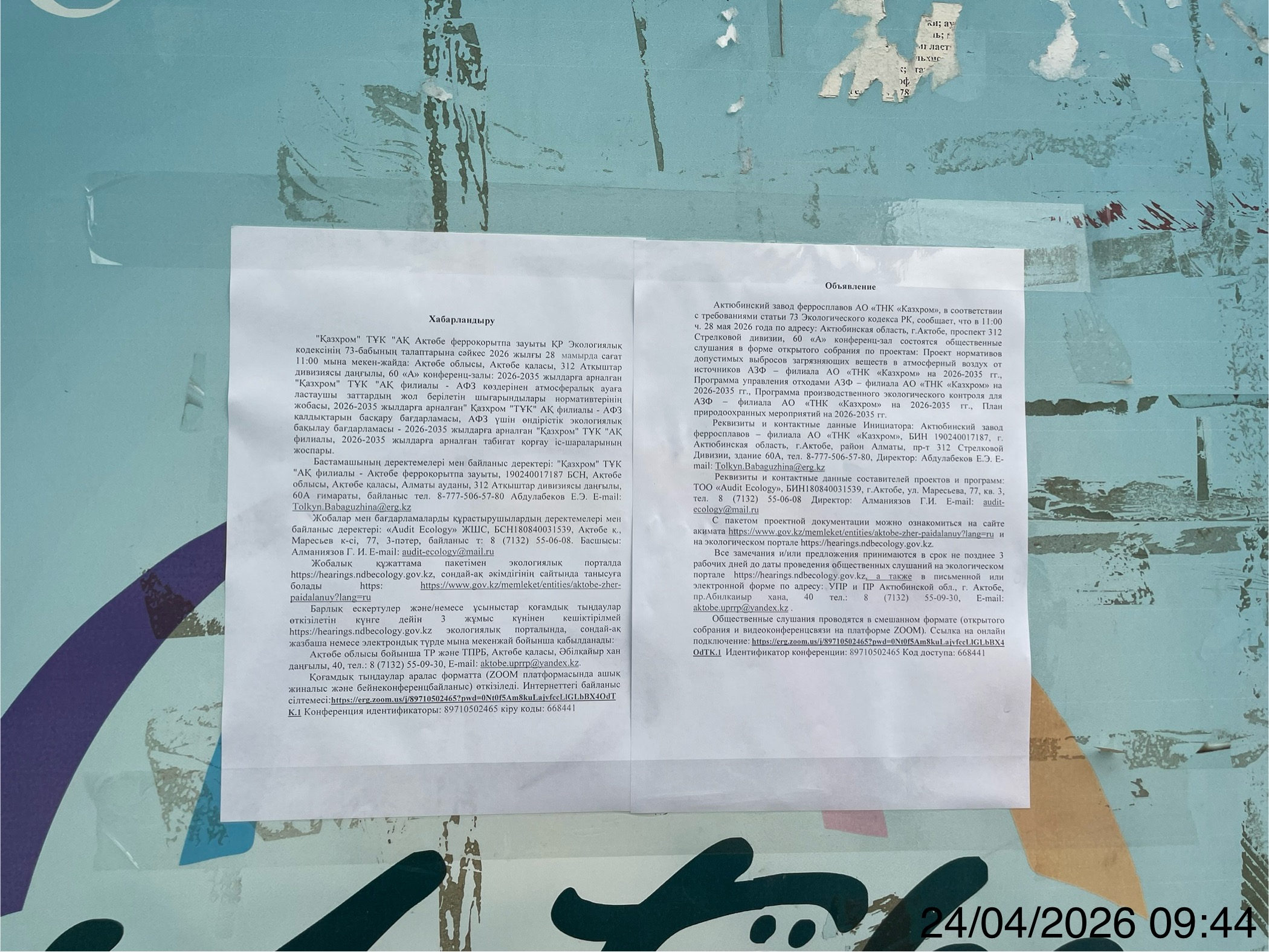 4. Повестка дня общественных слушаний: Проект нормативов допустимых выбросов загрязняющих веществ в атмосферный воздух от источников АЗФ – филиала АО «ТНК «Казхром» на 2026-2035 гг., Программа управления отходами АЗФ – филиала АО «ТНК «Казхром» на 2026-2035 гг., Программа производственного экологического контроля для АЗФ – филиала АО «ТНК «Казхром» на 2026-2035 гг., План природоохранных мероприятий на 2026-2035 гг. разработан в соответствии с Экологическим Кодексом РК и нормативными актами РК. Необходимость досрочной корректировки проекта нормативов ПДВ возникла в связи с изменениями на производственных площадках Актюбинского завода ферросплавов: - изменение годового расхода сырья и материалов; - включение дополнительных 112 источников выбросов, согласно проектам ОВОС; - переведение некоторых источников из организованных в неорганизованные: - ликвидированием 57 источников. Основная деятельность предприятия – производство ферросплавов различных марок, в том числе: высокоуглеродистого феррохрома (6 марок); среднеуглеродистого феррохрома (3 марки); низкоуглеродистого феррохрома (4 марки), а также металлоконцентрата (3 марки).Предприятие производит: феррохром, а также дополнительную продукцию: известь, углекислоту, жидкое стекло, огнеупорные изделия, щебень, ферропыль. Завод перерабатывает шлаки. В данном проекте проводится нормирование выбросов загрязняющих веществ в атмосферный воздух от источников на 2026-2035 гг. Запланирована ВКС Zoom Необходимо передать данную информацию всем участникам ВКС Дата ссылки Zoom: 28.05.2026 Meeting ID: 89710502465 Password: 668441 Ссылка для персонального подключения https://erg.zoom.us/j/89710502465?pwd=0Nt0f5Am8kuLajvfccLlGLbBX4OdTK.1 Если вы подключаетесь к ВКС Zoom впервые, рекомендуем за 15 минут до начала встречи проверить подключение.