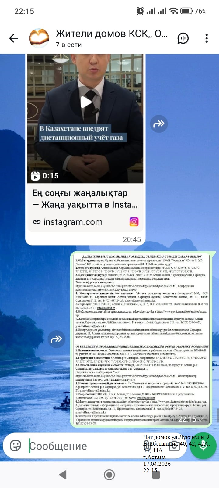 4. Повестка дня общественных слушаний: Основания для проведения Отчета о возможных воздействиях Согласно ст. 68 Экологического кодекса РК от 02.01.2021 г. №400-VI ЗРК (далее по тексту ‒ ЭК РК) уполномоченным органом в области охраны окружающей среды был проведен скрининг воздействий намечаемой деятельности, по результатом которого было выдано заключение об определении сферы охвата оценки воздействия на окружающую среду от 30.03.2023 г. № KZ65VWF00092787, выданное Комитетом экологического регулирования и контроля Министерства экологии, геологии и природных ресурсов РК (приложение 9). Согласно заключению об определении сферы охвата оценки воздействия на окружающую среду, необходимость проведения оценки воздействия на окружающую среду обязательна. «Переустройство ВЛ-110кВ на участке от ПС 110кВ «Городская» до ПС 110 «Астана» в кабельном исполнении» в соответствии с подпунктом 2 пункта 13 «Инструкции по определению категории объекта, оказывающего негативное воздействие на окружающую среду», утвержденной приказом МЭГПР от 19 октября 2021 года №408 относится к IV категории. Проект «Переустройство ВЛ-110кВ на участке от ПС 110кВ «Городская» до ПС 110 «Астана» в кабельном исполнении» разрабатывается в связи с необходимостью выноса существующей ВЛ-110 кВ отпайки к ПС 110/10 кВ «Астана» из зоны жилых застроек и переустройства района согласно генеральному плану детальной планировки утвержденного акиматом г. Астана. Начало реализации намечаемой деятельности – 3-й квартал 2026 года. Общая продолжительность – 3 месяца. На период строительства основными источниками загрязнения на проектируемом объекте являются: земляные работы; сварочные работы; малярные работы; гидроизоляция конструкций; пересыпка инертных материалов; работа вспомогательного оборудования; работа автотранспорта и техники. В период строительных работ на площадке будет 2 организованного источника выбросов вредных веществ в атмосферный воздух, включающий 2 источника выделений, и 5 неорганизованных временных источников выбросов вредных веществ в атмосферный воздух, включающий 14 источника выделений. В процессе работы источников в атмосферный воздух выделяется 21 загрязняющих веществ, с учетом автотранспорта, из них 1 групп веществ, обладающих эффектом суммации вредного действия. Объем выбросов вредных веществ отходящих от источников загрязнения атмосферы на период работ составит: - максимально-разовый – 2.4402883 г/сек (без учета передвижных источников); - валовый выброс – 4.4718444 т/год.