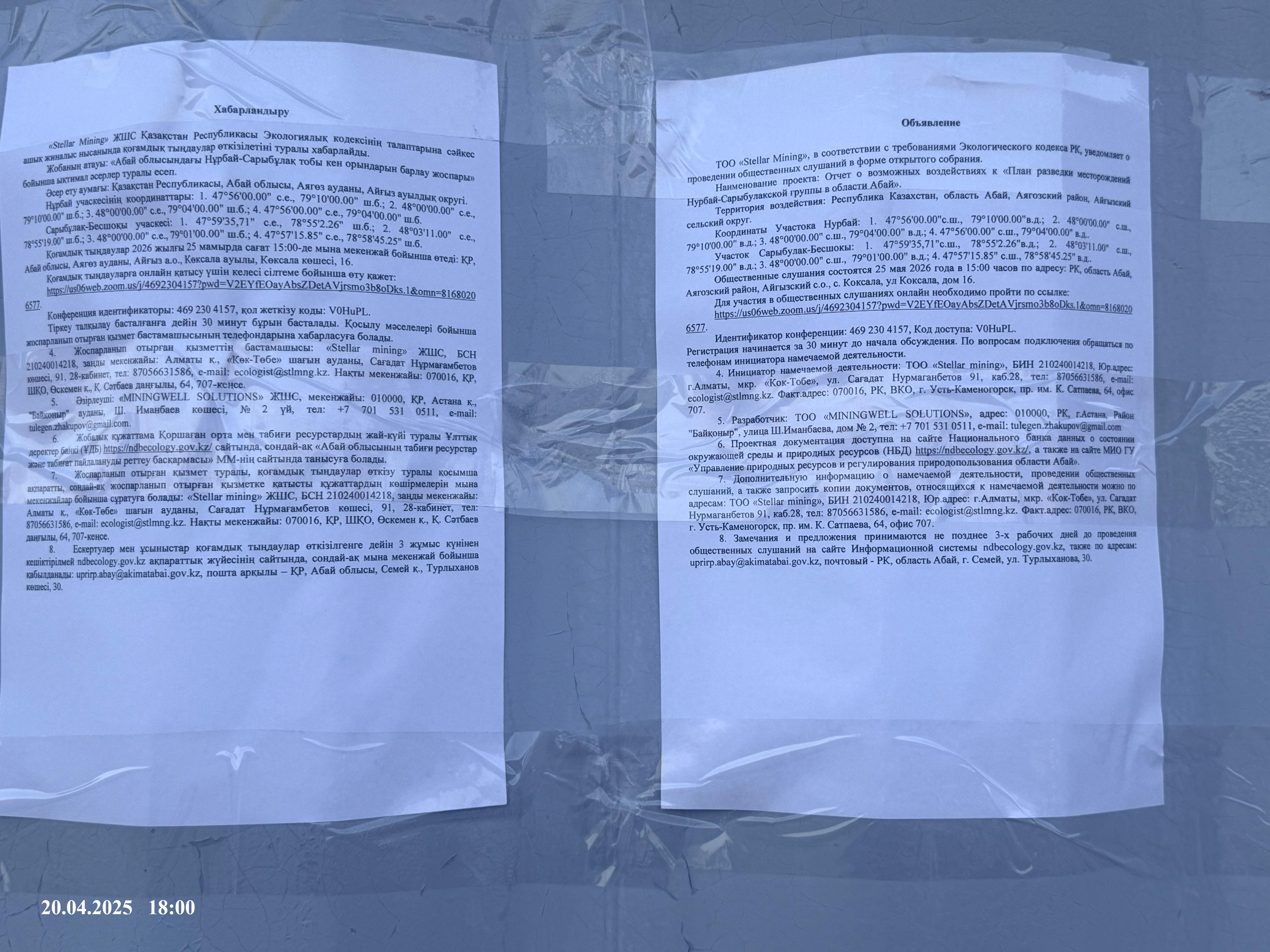 4. Повестка дня общественных слушаний: В административном отношении месторождениях Нурбай Сарыбулакской группы находится в Айгызском сельском округе, Аягозский район, область Абай. Ближайшая населенный пункт пос. Коксала расположен на расстоянии 4 км в южном направлении от участка Нурбай, в 34 км юго-восточном направлении до с.Айгыз. Площадь геологического отвода составляет 97,437 км2 (9743,7 га). Обоснование выбора места: Геологический отвод регистрационный № 1500-Р-ТПИ (г. Астана, 10 января 2025 г.) для осуществления операций по недропользованию на месторождении Нурбай-Сарыблулакской группы, на основании письма компетентного органа (№03-2-18/12460-И от 19.12.2023 г) и акта обследования участка разведки №68 от 23.08.24. Геологоразведочные работы на месторождениях Нурбай Сарыбулакской группы планируется проводить в соответствии с требованиями «Земельного кодекса Республики Казахстан», «Экологического кодекса Республики Казахстан», Кодекса РК «О недрах и недропользовании» и «Единых правил по рациональному и комплексному использованию недр при разведке и добыче полезных ископаемых», направленных на предотвращение загрязнения недр при проведении операций по недропользованию и снижению вредного влияния на окружающую среду. Геологические задачи и методы их решения: Проведение поисково-оценочных работ медных руд и сопутствующие полезные ископаемые на месторождениях Нурбай Сарыбулакской группы в пределах геологического отвода расположенного в области Абай с целью оценки и выявления коммерческого обнаружения; Провести анализ фондовых и исторических материалов. Основными методами поисков рудных тел и зон рудопроявлений являются поисковые маршруты, бурение колонковых скважин, геофизические исследования, опробование и оценочное сопоставление исследований с ранее выполненными работами. Оценка качества руд и попутных компонентов путем опробования, изучения технологических, минералогических, петрографических и др. свойств и особенностей, позволяющих комплексно исследовать рудопроявления. В результате выполнения поисково-оценочных работ должны быть выделены рудные зоны и рудные тела, при коммерческом обнаружении месторождений продление контракта для подсчета запасов и составления ТЭО. Полевые работы заключаются в проведении: - бурения скважин; - документации и фотодокументации керна скважин; - опробования и обработки проб; - топогеодезических работ. Бурение колонковых скважин предусматривается для проверки на рудоносность выявленных раннее зон, что позволит произвести коммерческое обнаружение. Бурение скважин выполняется передвижными буровыми установками. По рассматриваемому плану разведки на 2026-2027 года планируются следующие работы: 1.Бурение скважин - 6000 п.м. в количестве 33 скважин. a)Геологическое сопровождение бурения, оперативная документация керна; b)Опробование керна с выделением минерализованных интервалов – 6500 проб; c)Обязательное проведение аналитических работ в аккредитованной лаборатории ALS; d)Уточнение геологической модели и структуры рудных тел. 2.Проведение геофизических работ электроразведка и магниторазведка для выявления аномальных зон – 60 кв.км. 3.Бурение 7 гидрогеологических скважин – 800 пог. 4.Бурение глубоких 6 гидрогеологических скважин и проведение опытно-фильтрационных работ – 2000 пог.м. 5.Бурение 8 сква