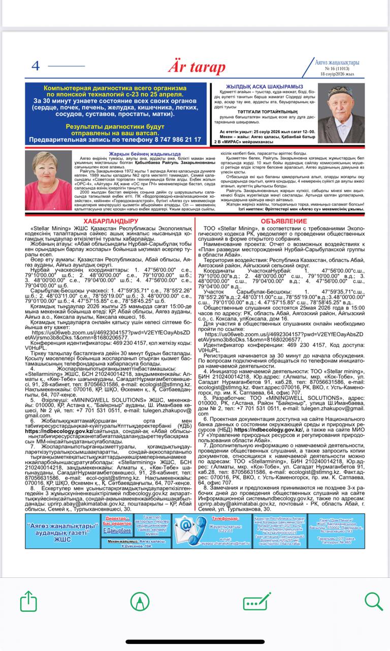 3. Общественные слушания организованны: Главный специалист УПР и ПР область Абай, uprirp.abay@akimatabai.gov.kz,