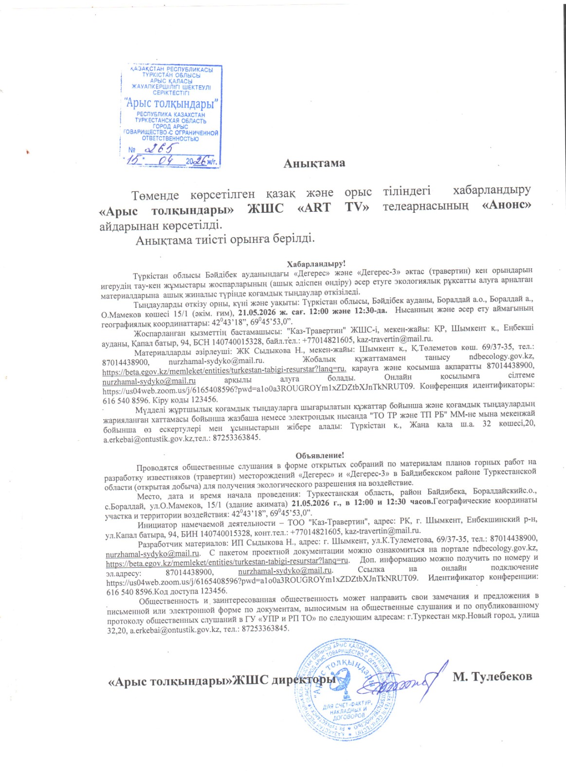 3. Общественные слушания организованны: Управление природных ресурсов и регулирования природопользования Туркестанской области, a.erkebai@ontustik.gov.kz,