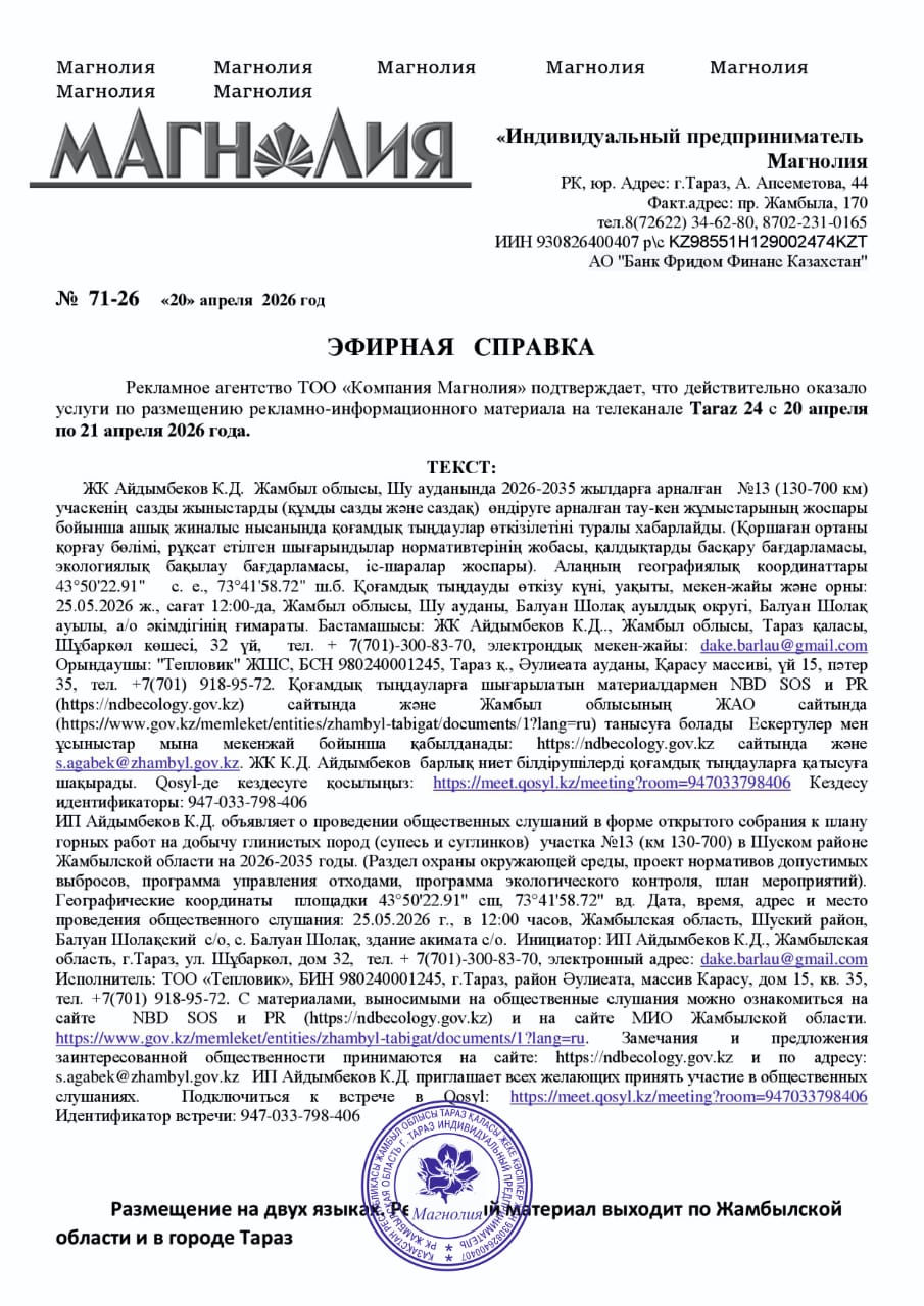 3. Общественные слушания организованны: Управление природных ресурсов и регулирования природопользования Жамбылской области, s.agabek@zhambyl.gov.kz,