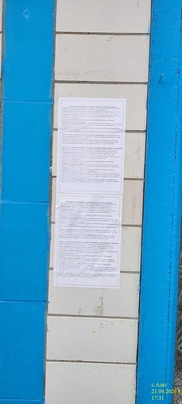 6.3. расположение мест, специально предназначенных для Размещения печатных объявлений (доски объявлений): Аппарат акима с.Азат, местные продовольственные магазины