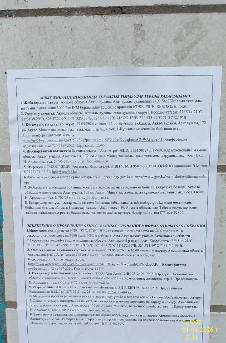 5.4. Дополнительная информация о административно-территориальных единиц: Общественные слушания будут проводить в административно здании на территории предприятия. Будет обеспечено присутствие жителей с.Азат для участия. Ссылка для онлайн подключения: Подключиться к конференции Zoom: https://us04web.zoom.us/j/72497572521?pwd=z7MalRfEag0xrDvwqbrmhCNWALqtAF.1, Идентификатор конференции: 724 9757 2521, Код доступа: 12345