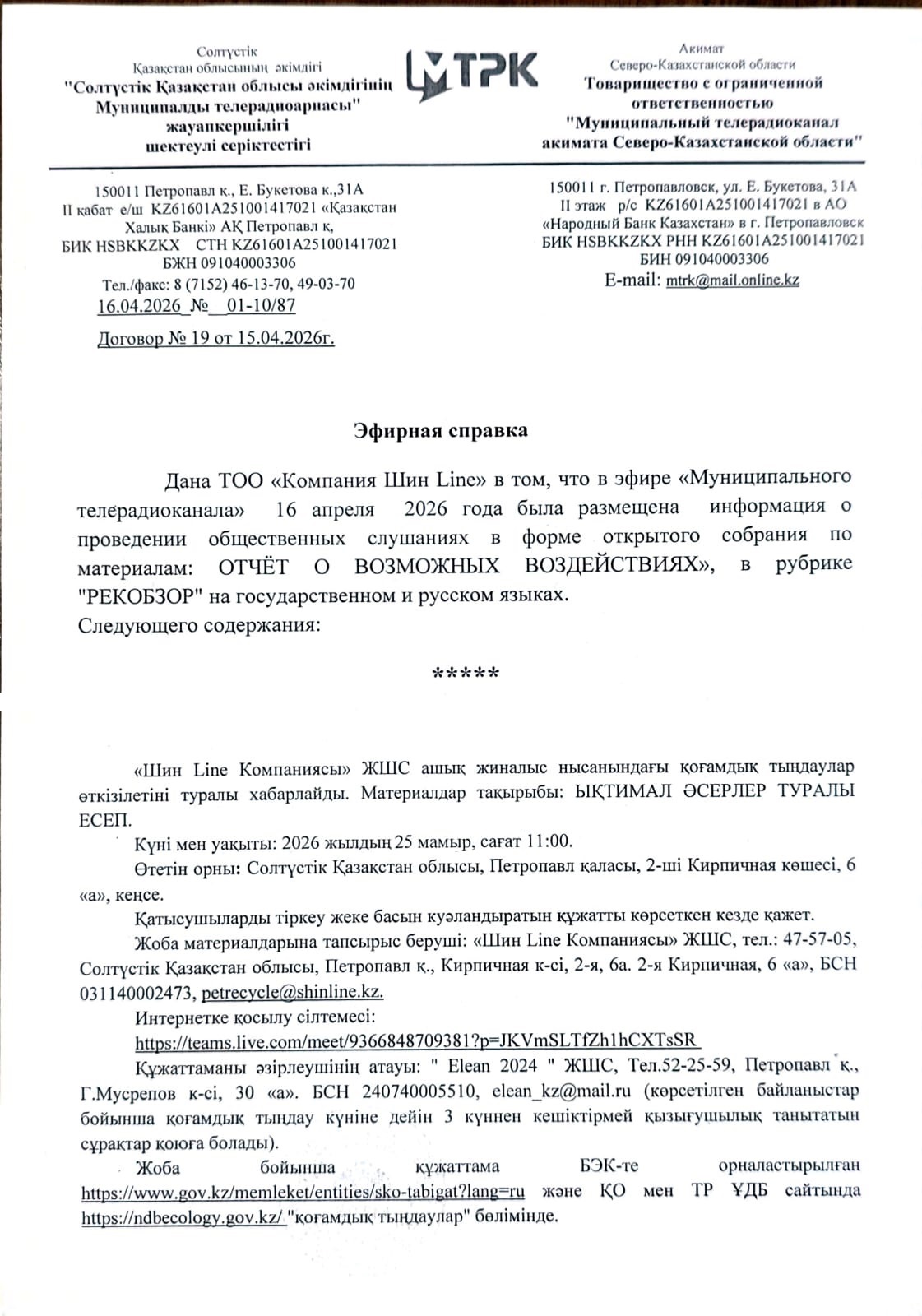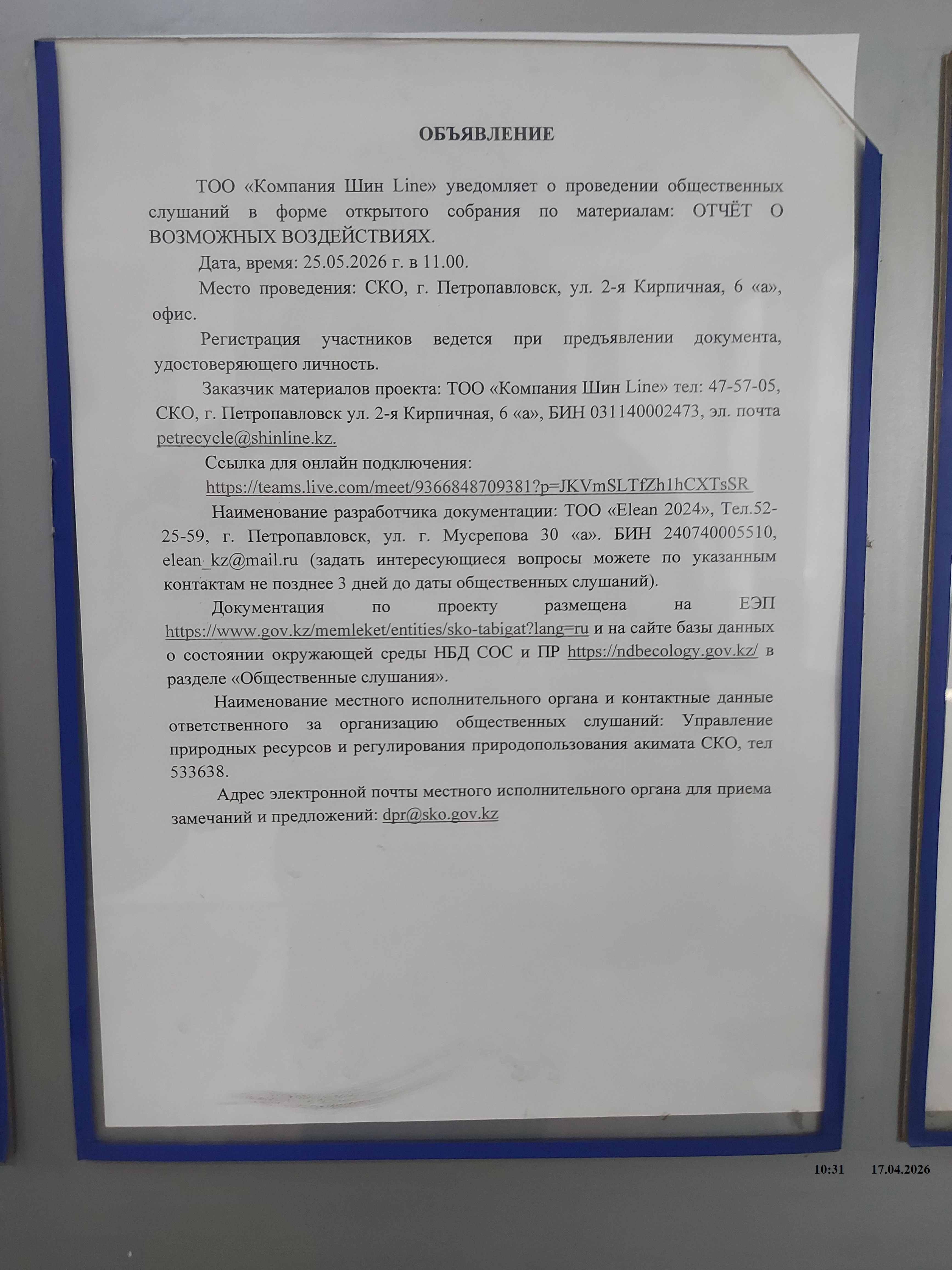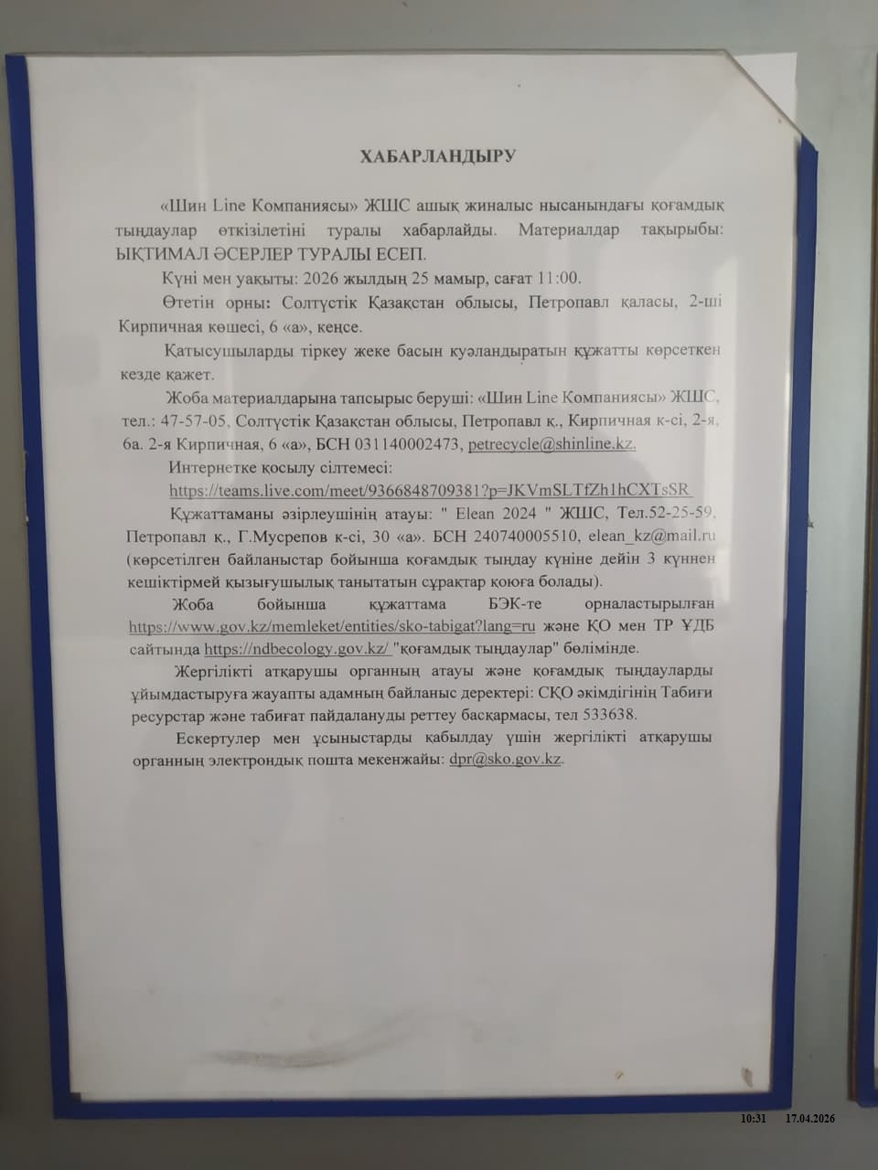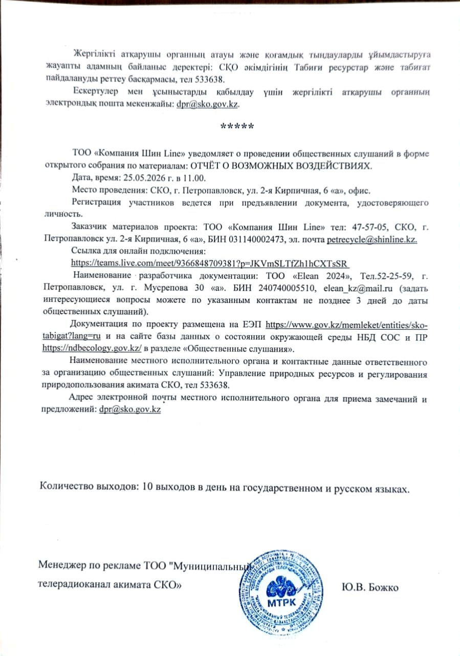3. Общественные слушания организованны: Управление природных ресурсов и регулирования природопользования Северо-Казахстанской области, a.sapozhnikova@sko.gov.kz, dpr@sko.gov.kz. тел: 8 (7152) 53-36-38,