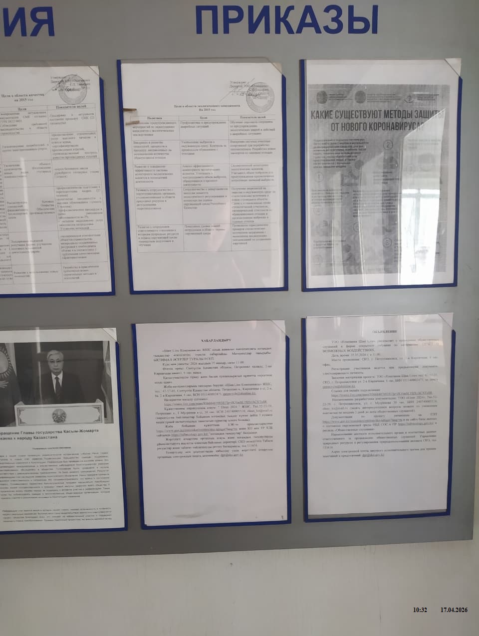 6.3. расположение мест, специально предназначенных для Размещения печатных объявлений (доски объявлений): Северо-Казахстанская область, Петропавловск Г.А., г. Петропавловск, улица 2-я Кирпичная 6а, доска объявлений у входа в офис