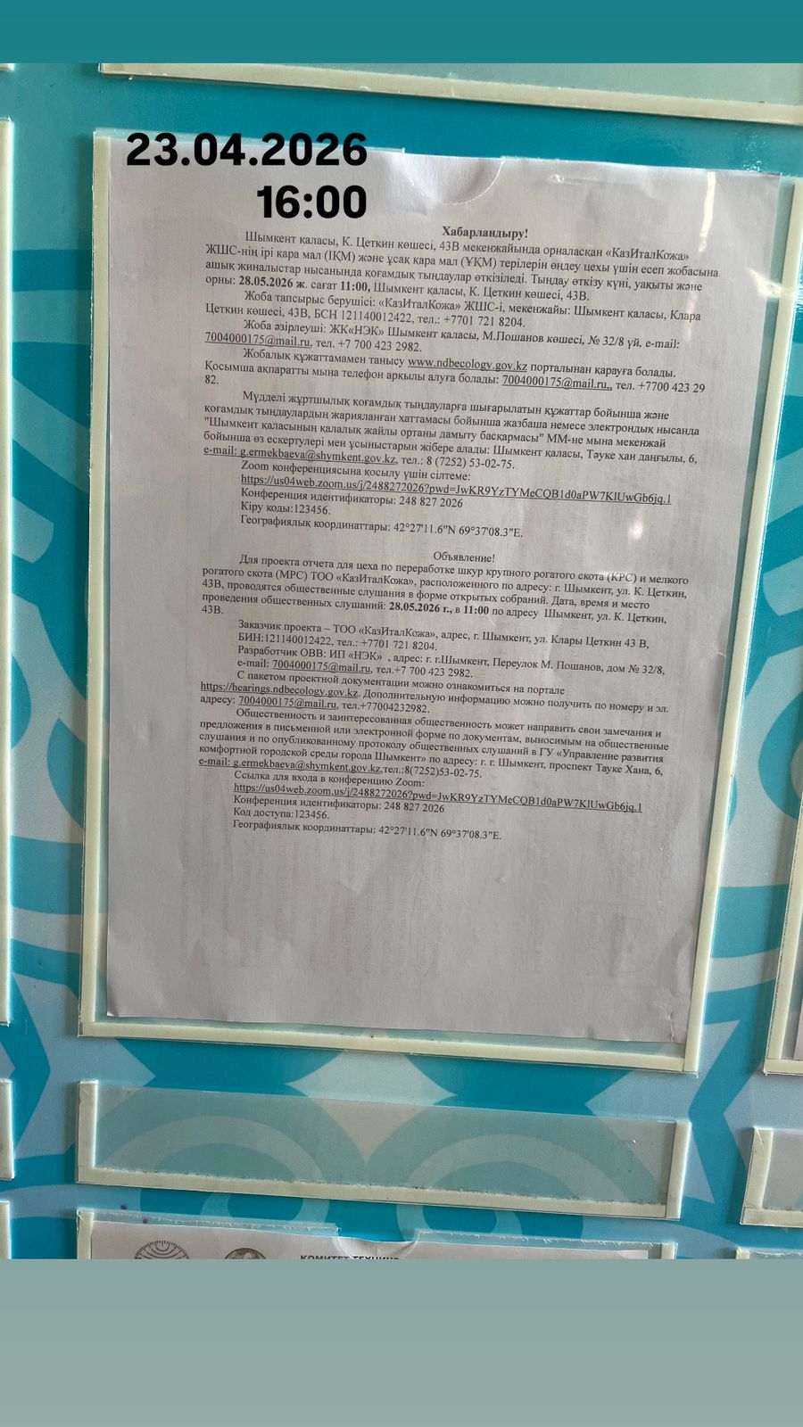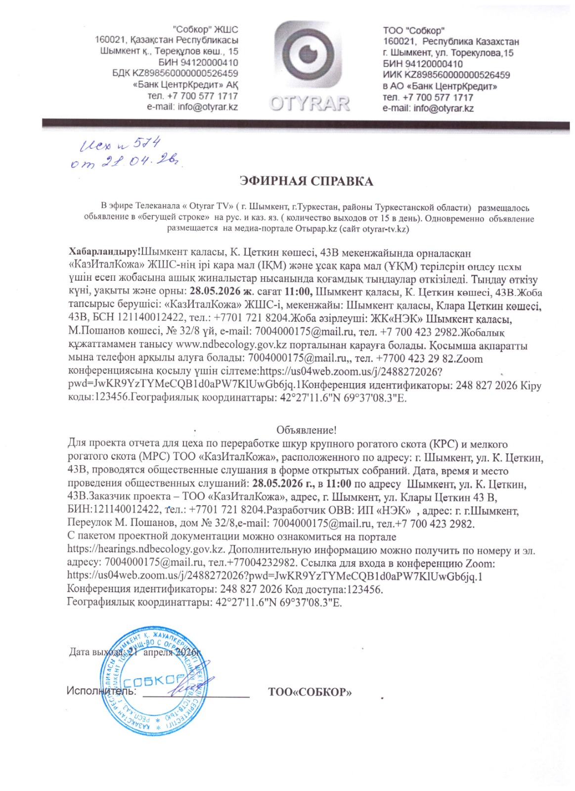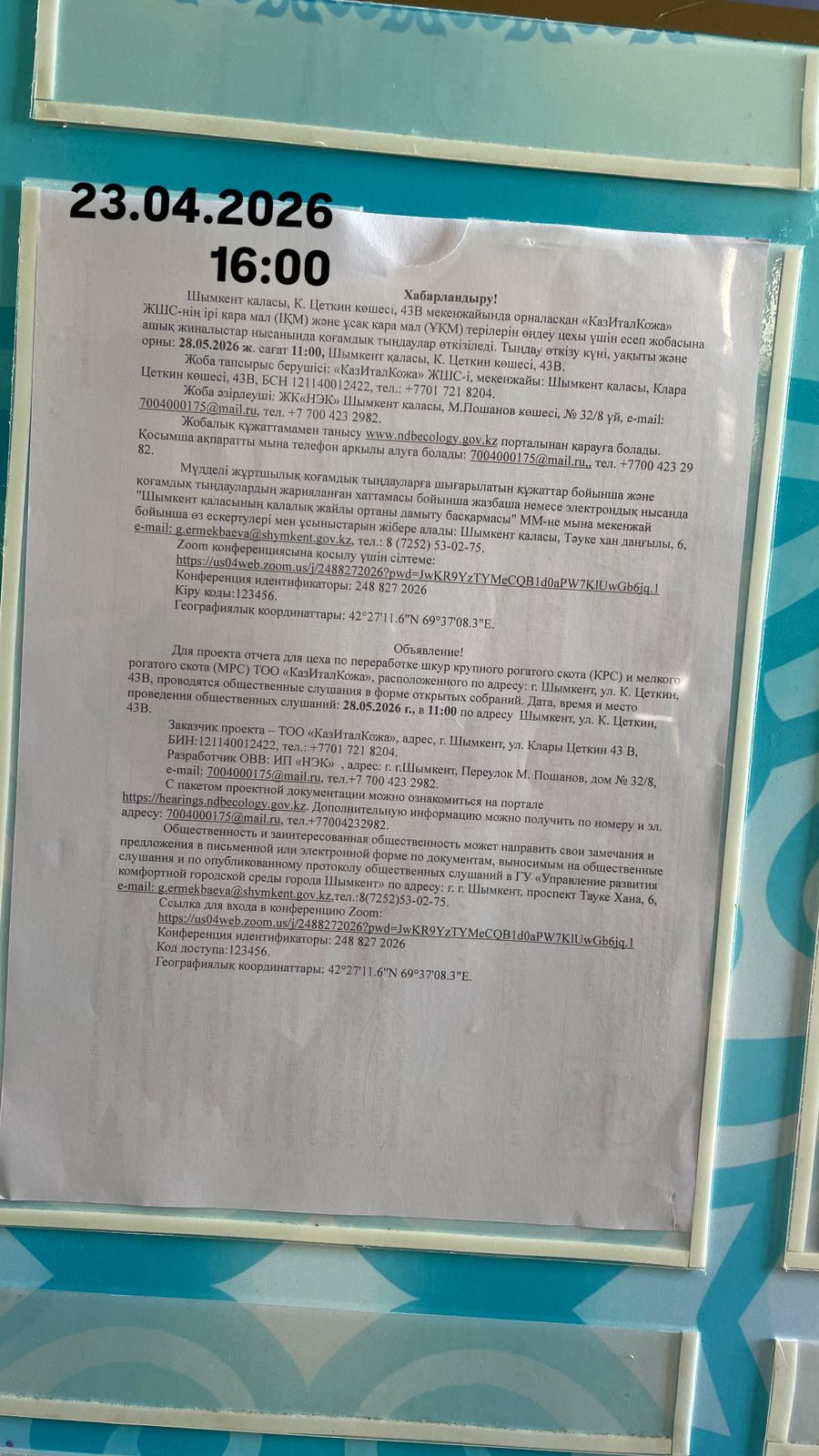 По проекту: Отчет о возможных воздействиях (ОоВВ) для цеха по переработке шкур КРС и МРС ТОО «КазИталКожа» расположенного по ул.К.Цеткина 43В, г.Шымкент